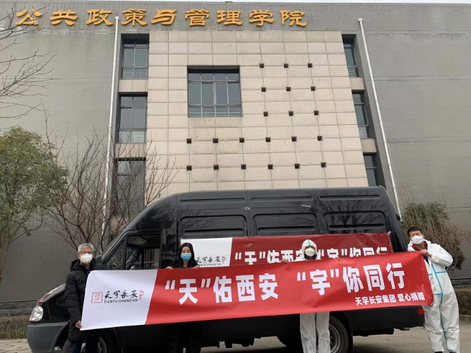 在新的一年即将来临之际,在西安全民抗疫的关键时刻,通过公司员工、2008级法学系毕业生郭海松的积极联系、协调,陕西天宇长安集团由行政总监任瑞君带队向公司捐赠6万只医用无菌口罩。2021年12月31日,公司经理刘晨光、党委副书记谢丹分别在友谊校区和长安校区代表公司接收了这批防疫物资。