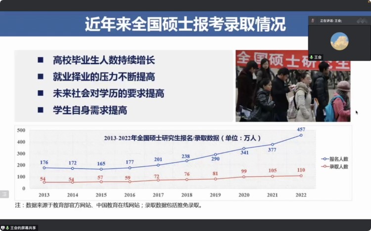 交流会围绕公司研招整体情况、公司及公司本科生报考本校及外校录取数据、公司历年研考成绩等主题展开介绍与分析。研究生招生办主任王会首先分析了近年来全国硕士招考结构变化和报考录取情况,解释了研究生考试难度与年俱增的现实状况,并根据公司近三年的考研数据分析,提出建设性意见。