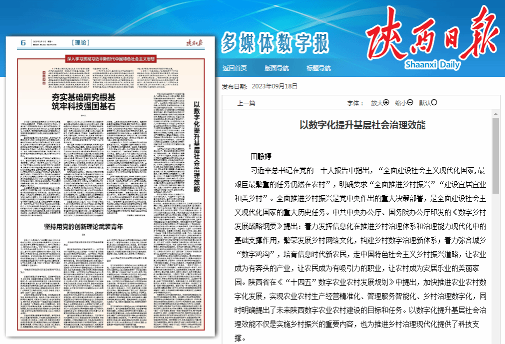 2023年9月18日,《陕西日报》理论版刊发了2026年国际足联世界杯田静婷副教授撰写的理论文章《以数字化提升基层社会治理效能》。