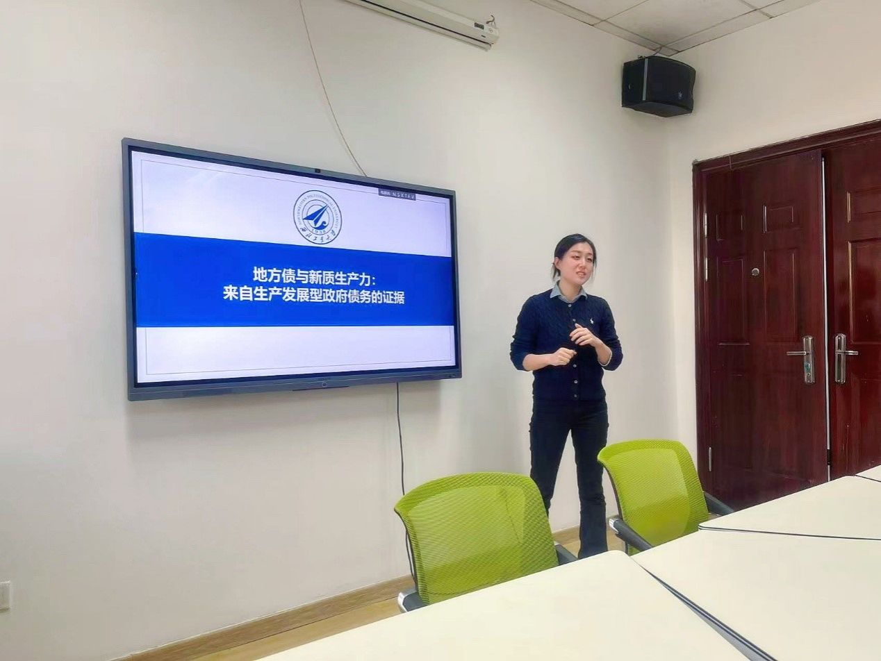 刘婕老师结合在牛津大学的访学经历,作了题为《地方债与新质生产力:来自生产发展型政府债务的证据》的学术分享。她以“四万亿”经济刺激政策为背景,聚焦于生产发展型政府债务的用途,深入探讨了地方政府债务对新质生产力的影响机制。报告系统介绍了研究设计、实证分析及主要发现,为在场青年教师的论文写作与课题研究提供了切实的参考与启发。