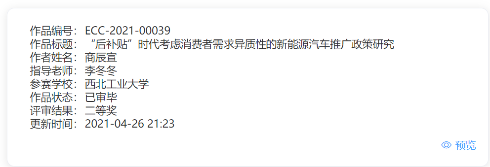 426日,第七届全国老员工能源经济学术创意大赛评审结果公布,公司参赛作品《“后补贴时代考虑消费者需求异质性的新能源汽车推广政策研究》通过专家通讯评审和专家会评,获得全国二等奖。该作品由公司20级本科生商辰宣完成,指导教师为公共管理系助理教授李冬冬老师。