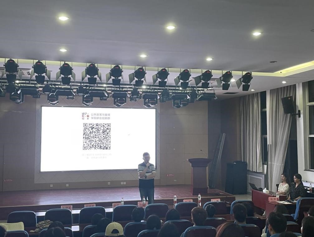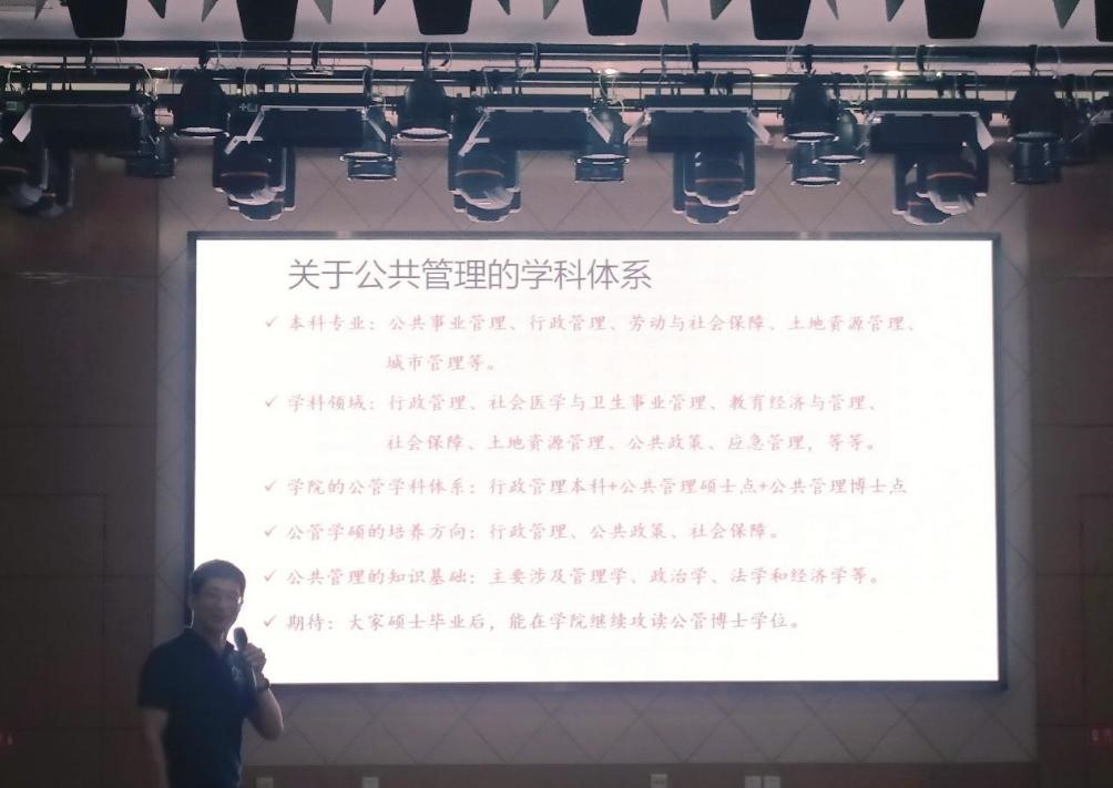 第一位是公共管理系主任——寇晓东副教授,他热烈欢迎了各位研究生新生的到来,并详细介绍了公共管理的学科体系,多角度多层次地展开讲述公共管理的学科团队,鼓励同学们做好科研、为未来继续攻读博士研究生做好目标设想,并对大家提出了殷切期望:告别大学本科四年,开启学者生涯。