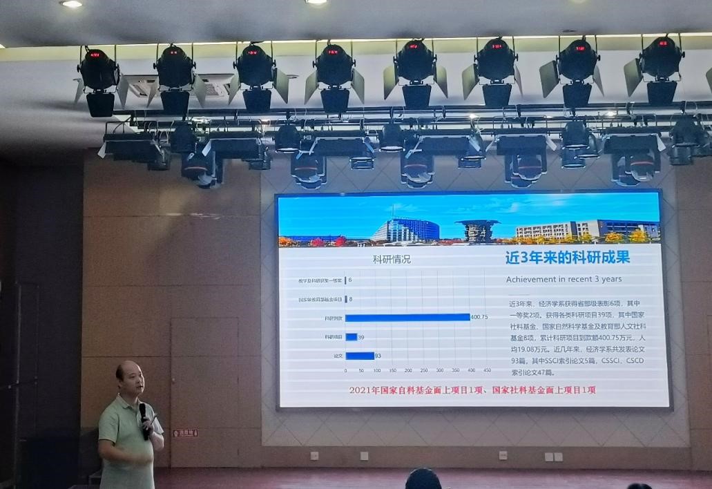 第二位是经济学系主任——袁晓军副教授,袁老师详细介绍了公司经济学系的基本情况,并通过大数据展示了目前的经济学领域的研究热点以及经济学系的研究聚焦(方向)。谈话间,幽默风趣中饱含哲理,短短几十分钟的汇报蕴含着无穷的启示,在场的同学都反响积极,一片欢声笑语中气氛活跃,又收获颇丰。