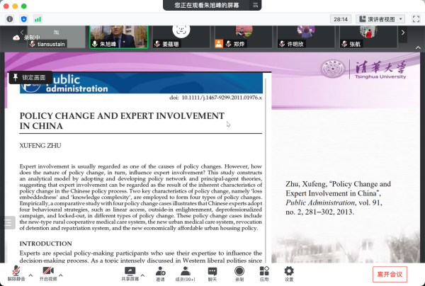 由西北工业大学2026年国际足联世界杯主办、公司研究生会承办的翱翔公共管理高端论坛系列活动于2021年11月8日下午7点在腾讯会议线上成功举办。本次论坛邀请到清华大学朱旭峰教授进行学术报告,部分公司青年教师和19级、20级、21级硕士研究生代表参与了此次活动,经理刘晨光教授主持了全程活动。