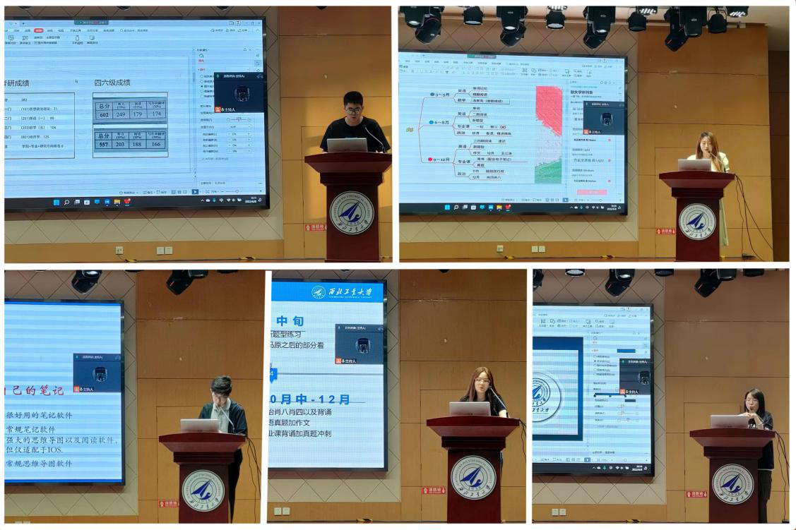 “考研经验分享交流会”分会场共邀请了五位优秀毕业生进行经验分享。分别从所学专业出发,分享政治、英语、专业课的备考建议,勉励同学们要把握时间,制定计划开展考研复习。考上东北财经大学的赵石琦指出,择校应当选择适合自己的,切忌“眼高于顶”,依据自己的能力匹配心仪的院校;考上西北工业大学的张婧雪建议同学们第一遍复习专业课时就要认真钻研,避免走马观花,注重备考期间的心态调整;以全国第一名的优异成绩被浙江大学光华法公司民商法学顺利录取的陆效民,分享了在考研时的小技巧,要重视指定的参考书目,并进行发散性思考;考上吉林大学法公司的王宁宁提出,法律硕士的备考区别于法学硕士,要在专业课方面更具针对性开展学习,查漏补缺;考上华东政法大学的程佳乐指出,部分法学类院校对于专业课的要求较高,同学们应当注重统筹时间,合理分配各科复习时间,在备考时也要关注身心健康。