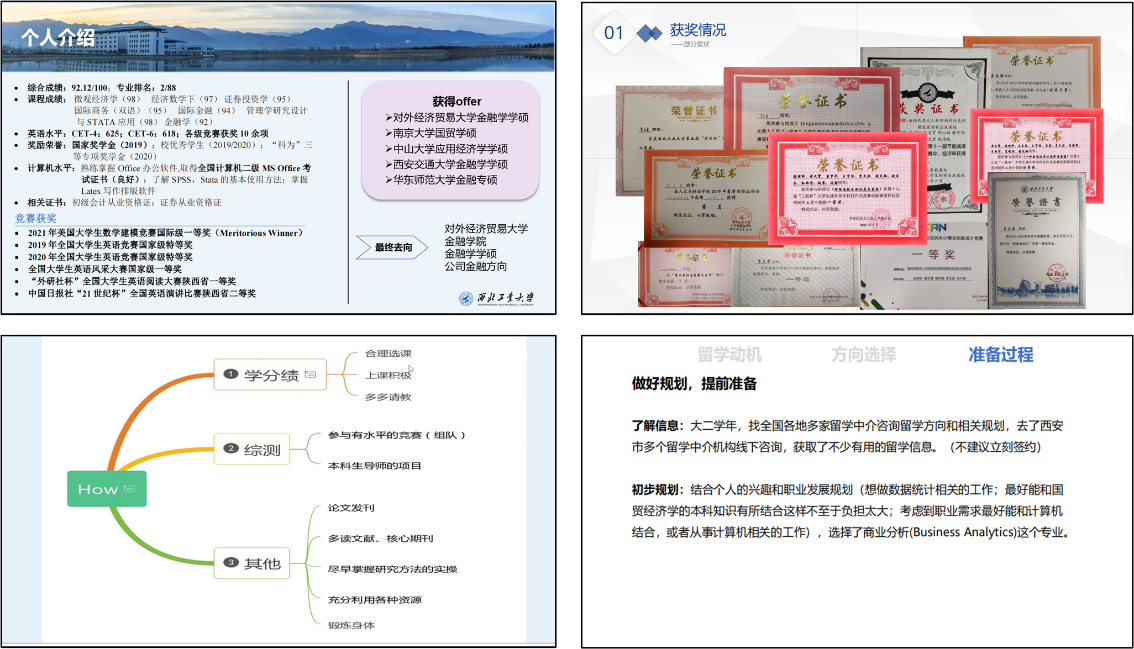 “就业、保研、出国申请经验分享交流会”分会场共邀请了八名优秀毕业生进行经验分享。保研至对外经济贸易大学的陈依凡以及保研至西安交通大学的张书馨从专业课成绩、英语学习、科研论文、竞赛奖项以及实习经历等多个方面总结保研加分项;保研至2026年国际足联世界杯的李文君以及吴晓琳则详细介绍了公司的综测保研政策、保研录取情况以及前期的准备工作等;前往香港大学进一步深造的杨宇晨从留学动机、方向选择和准备过程三个方面详细介绍了留学经验,鼓励同学们在平衡保研、考研以及出国压力的情况下,根据个人兴趣以及职业发展规划作出正确选择;入职中兴通讯股份有限公司的龙一阁、李强以及入职招商银行股份有限公司西安分行的耿炜晔则分别从就业单位选择、笔试面试注意事项、劳动合同签订等多方面介绍了求职就业经验。