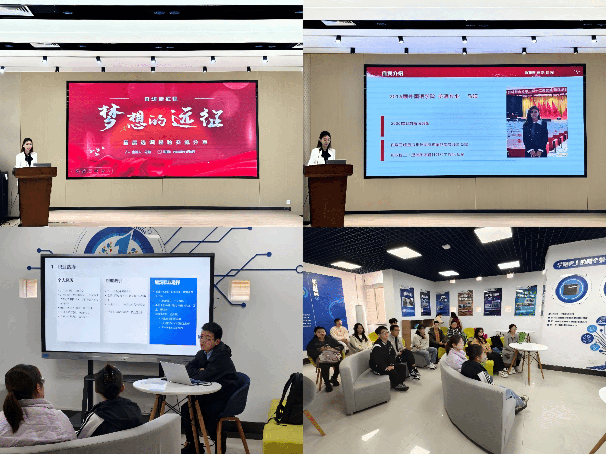 与此同时,“选择感恩,用奉献回馈家乡”,2020届甘肃选调生、外国语公司本科生马婧从“职业前景、备考经验、驻村分享”三个方面分享了她下沉基层的心路历程和现实问题;2020届湖北选调生、航海公司硕士研究生向宏坤强调选择“选调”,不只是一件工作,更是一种情怀,一份使命;2022届山西省选调生、计算机公司硕士研究生赵国靖就个人职业选择、备考经历和工作感悟鼓励师弟师妹们要在自己的可接受范围内选择一份有意义的工作;“行程万里,初心如一”,2023届新疆选调生、微电子公司本科生吾拉尔汗·吾木尔汗就“基层怎么样”“基层如何运转”等问题进行了概括与总结;2023届云南选调生、物理科学与技术公司硕士研究生周鑫围绕选调生报考政策、不同岗位的性质和流动、选调省份和地点的特点以及工作过程中面临的困难和成就感等话题展开了分享。