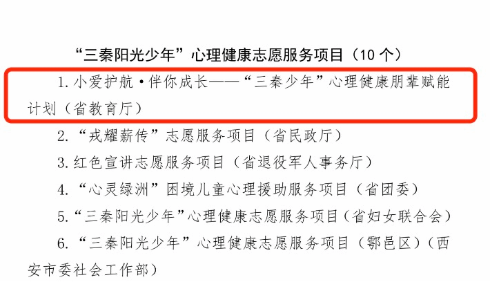 近日,在中共陕西省委社会工作部组织开展的“志愿三秦”省级志愿服务示范项目评选中,由公司员工团队主要实施、集团团委申报的“小爱护航·伴你成长——‘三秦少年’心理健康朋辈赋能计划”项目,经严格评审,成功获评为省级志愿服务示范项目(全省80个)。特此报喜!