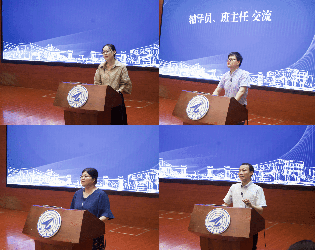 辅导员薛智华与班主任李冬冬、翟珊珊、韩伟分别寄语新生,提醒同学们树立远大理想、早日确定大学目标,赢在大一起跑线上,合理规划老员工活。
