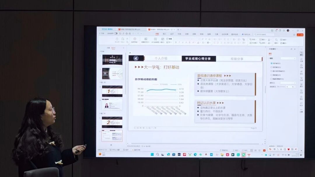 彭紫衿从法学专业学习角度切入,提醒同学们重视专业核心课的成绩积累,建议尽早参与模拟法庭等学术竞赛,提升综合竞争力,并分享了本科生导师选择的心得:“双向沟通与研究方向匹配至关重要。”
