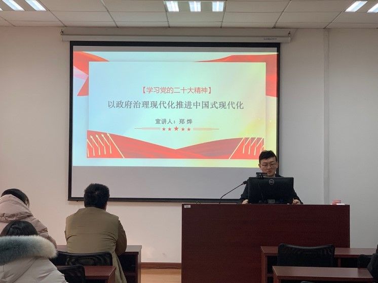 郑烨老师以《以政府治理现代化推动中国式现代化》为题,系统阐述了现代化的概念和历史演进,中国式现代化建设的背景和国际环境,中国式现代化的特征、本质要求和战略安排,政府治理现代化的内涵和特征,政府治理现代化推动中国式现代化的现实路径等,帮助青年理论学习小组深刻领会党的二十大精神。