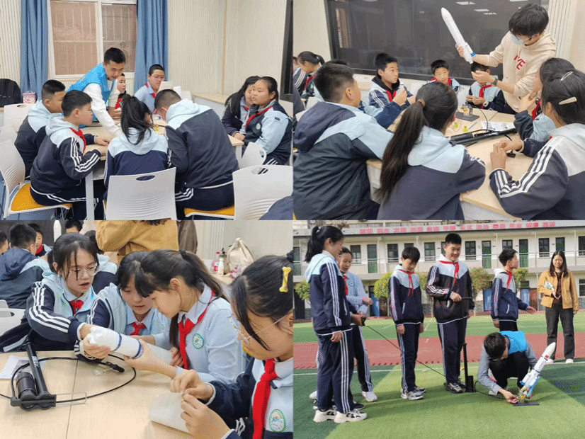 接下来,志愿者们分小组带领孩子们开展了火箭制造手工实践,在志愿者的指导下,孩子们自己设计火箭的外形,改造火箭的结构,充分发挥自己的想象力并切身了解助推器的有关原理,对航天知识的兴趣愈发浓厚。最后,在所有小组完成火箭组装后,志愿者带领孩子们来到操场进行火箭发射实验,随着火箭腾空而起,孩子们的求知愿望和飞天梦想也生根发芽。