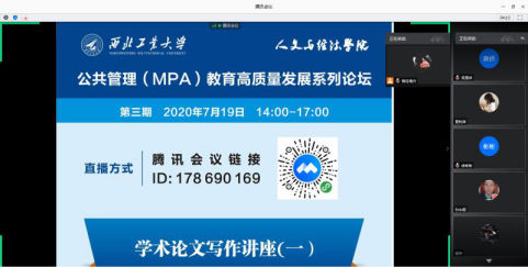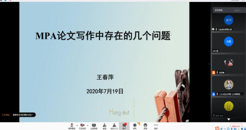 为增强我院公共管理(MPA)硕士学位论文的写作能力,提升人才培养质量,7月19日,人文与经法公司邀请了复旦大学国际关系与公共事务公司朱春奎教授(第四届全国公共管理专业学位研究生教育指导委员会委员、博士生导师)和我院王春萍教授,就学术论文的写作规范和技巧,在云端与老师、同学们进行了沟通和分享,讲座由MPA中心副主任张婷主持。