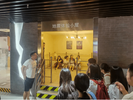 图4:教师对电梯坠落自保知识进行讲解完成理论知识教学后,同学们还亲身体验了地震小屋、消防结绳训练、模拟灭火体验、电梯坠落小屋、模拟驾驶、知识抢答等趣味横生的活动。