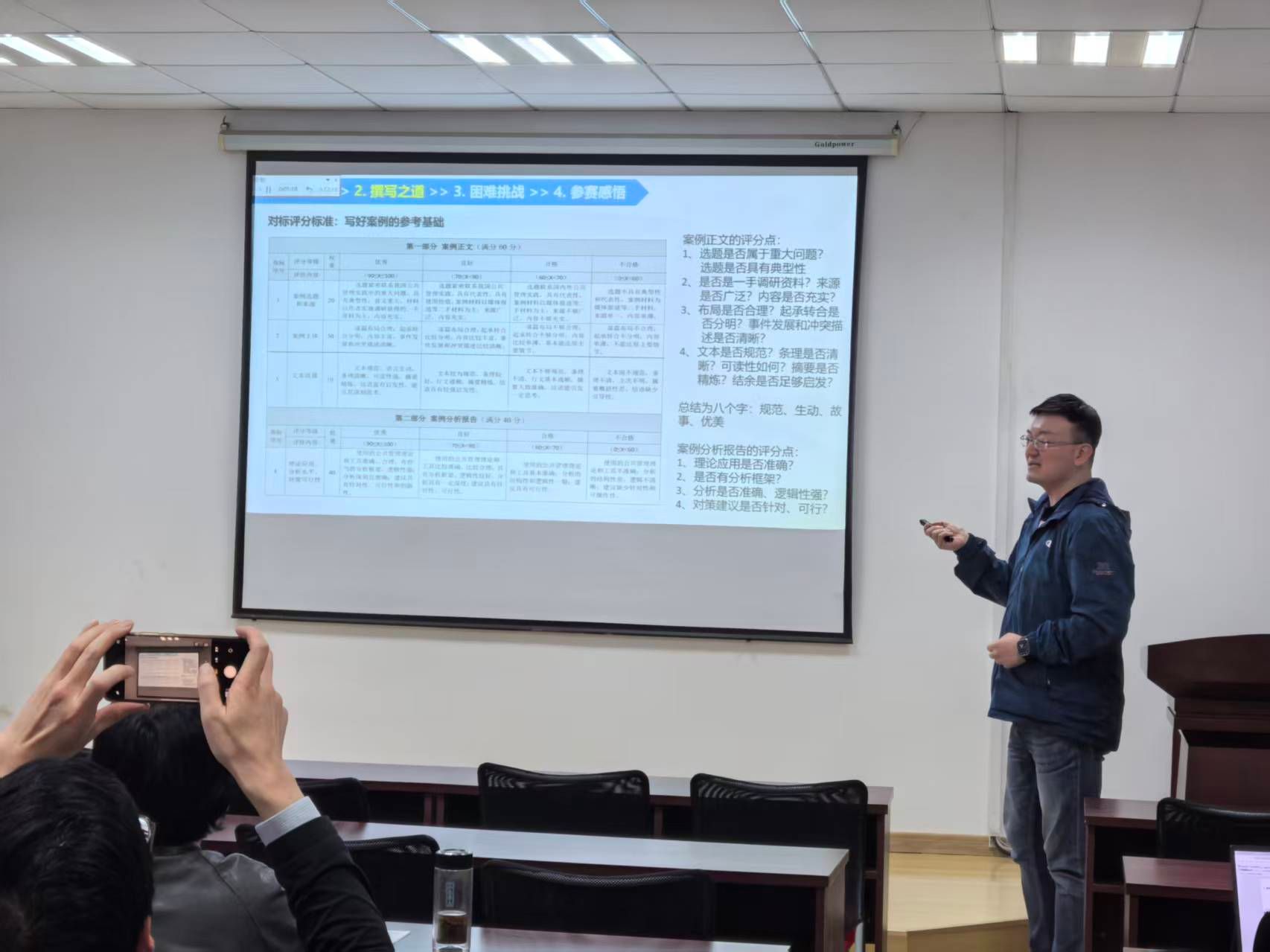 会议最后,郑烨老师进行了案例经验分享。他结合指导MPA员工参与案例大赛及开展案例开发的丰富经验,从案例的选题、撰写、分析方法到教学应用,进行了系统而详实的介绍。